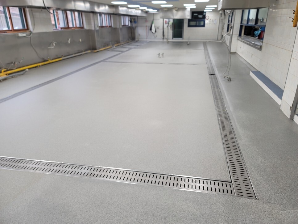 대표적으로 조리실이나 급식실바닥, 공장이나 냉동/냉장 창고 바닥 등 실내 도막형바닥재 부터